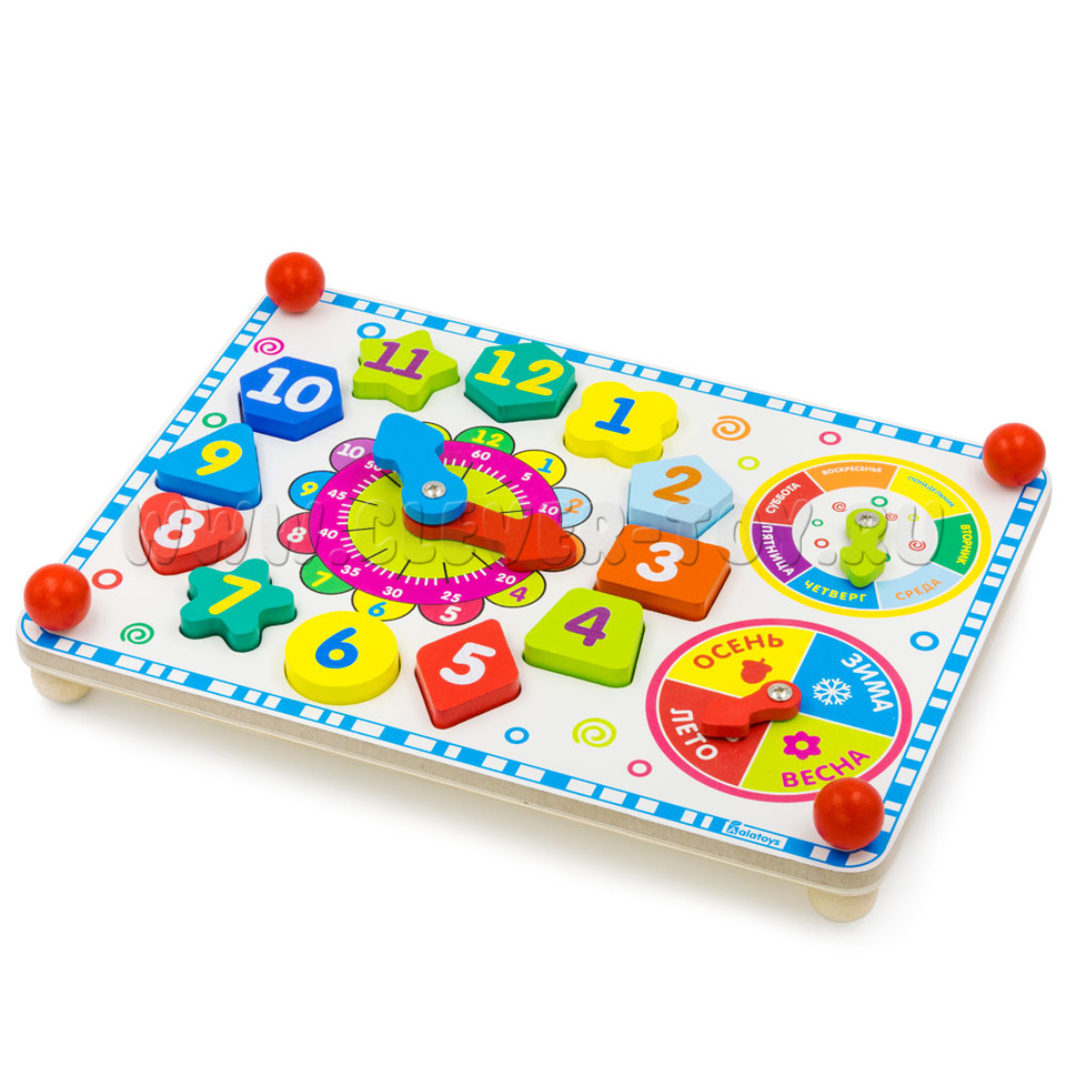 Фигуры расположены вокруг циферблата. С обозначением цифр от 1 до 12, разной формы и разных цветов. Поможет малышу познакомиться с геометрическими фигурами, развить логику, мелкую моторику. - Держатели-шарики по углам 4 шт.