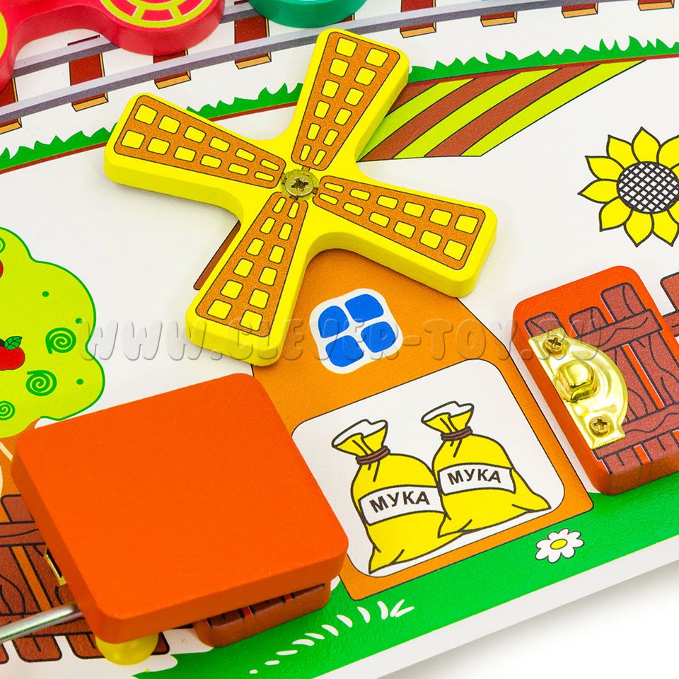 На вагончиках, а также на домике и мельнице есть открывающиеся дверцы с замочками-крючками и замочками-защёлками. Они приведут вашего малыша в восторг и подарят много увлекательных сюжетных игр. - Крылья мельницы 1 шт.