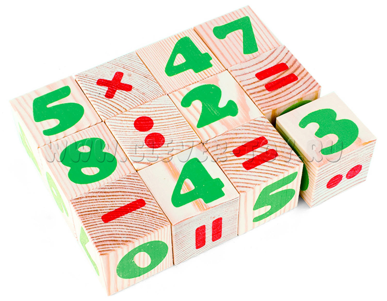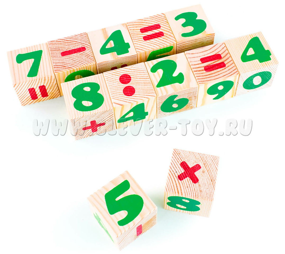 В состав входит девять кубиков с цифрами и простейшими математическими операциями.