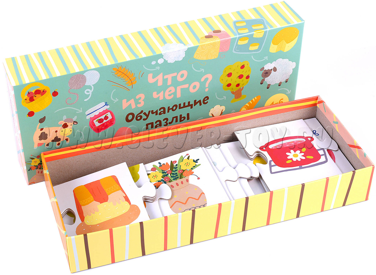 Развивающие пазлы "Что из чего?" подойдут малышам старше 4 лет и ответят на самые часто задаваемые вопросы: откуда это берется? Из чего это сделано? Как, почему? Дети и их родители смогут в легкой игровой форме разобраться, из чего делают хлеб и сыр, как шьют платья, из чего сделана ваза; поговорят о профессиях, материалах и их источниках.