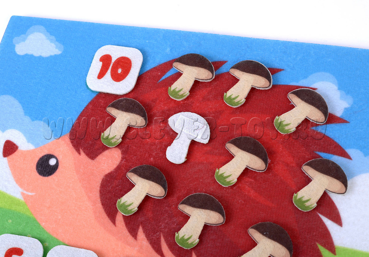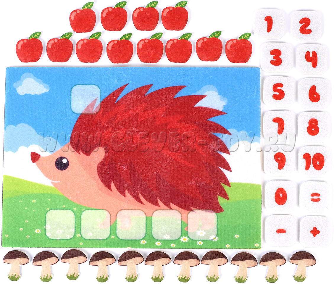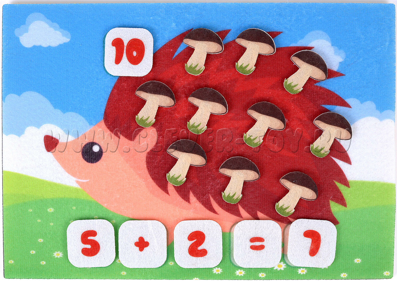 Малыш получит огромное удовольствие, нацепляя на колючки лесного добряка грибы и яблоки, учась в процессе считать предметы. «Сколько грибов на спине у ежика? А сколько яблок?» - вот только один из вариантов игры с мягкой аппликацией. А если нужно освоить сложение или вычитание? Не проблема! Помимо грибов и яблок, в игре есть цифры и арифметические знаки.