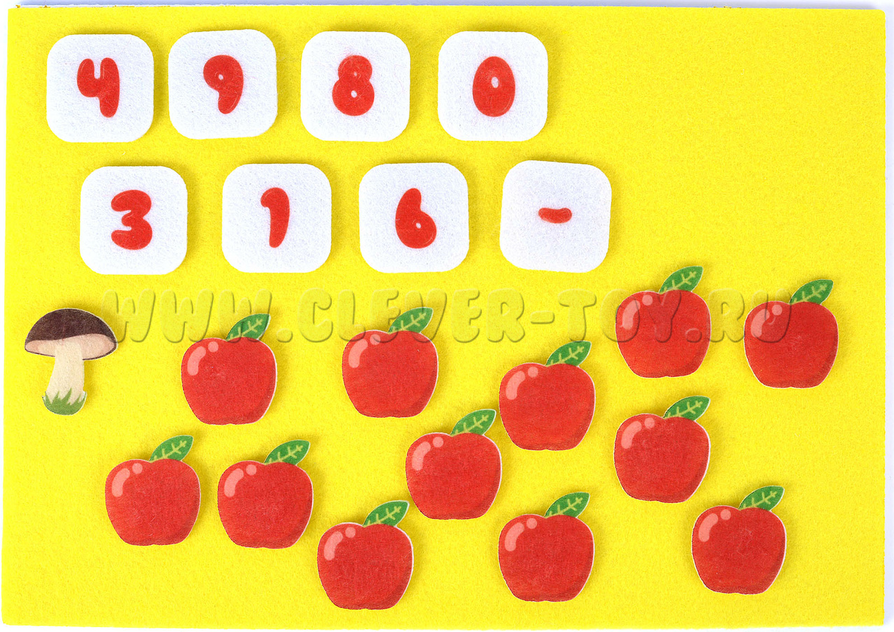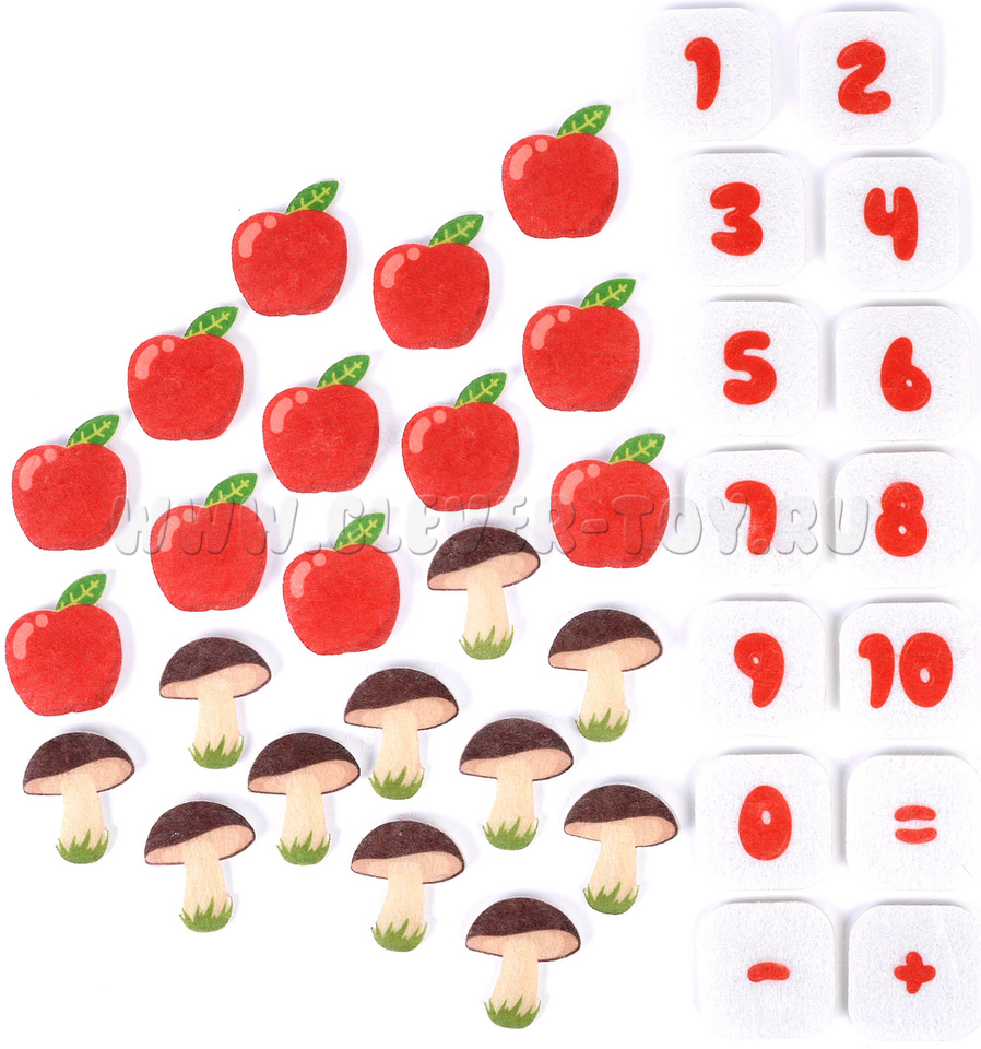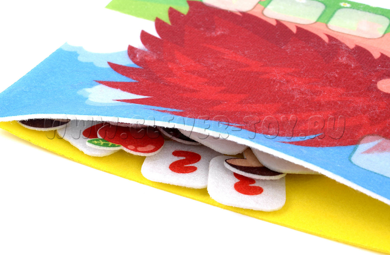 Малыш получит огромное удовольствие, нацепляя на колючки лесного добряка грибы и яблоки, учась в процессе считать предметы. «Сколько грибов на спине у ежика? А сколько яблок?» - вот только один из вариантов игры с мягкой аппликацией. А если нужно освоить сложение или вычитание? Не проблема! Помимо грибов и яблок, в игре есть цифры и арифметические знаки.