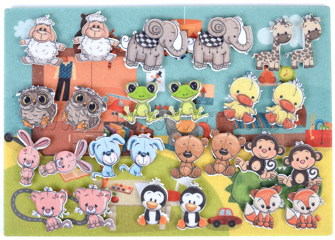• 35 забавных зверушек из фетра – все представлены одинаковыми парами, есть также пары, отличающиеся друг от друга позами – совята, слонята, жирафики, бегемотики, обезьянки, собачки, мишки, овечки, лягушки;