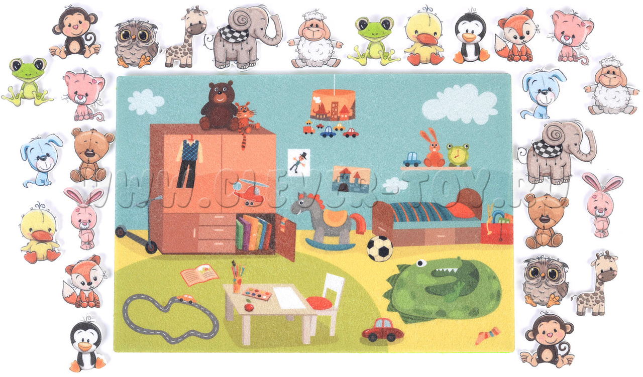 • тематическое игровое поле в виде детской комнаты, куда помещаются все мягкие игрушки на липучках;