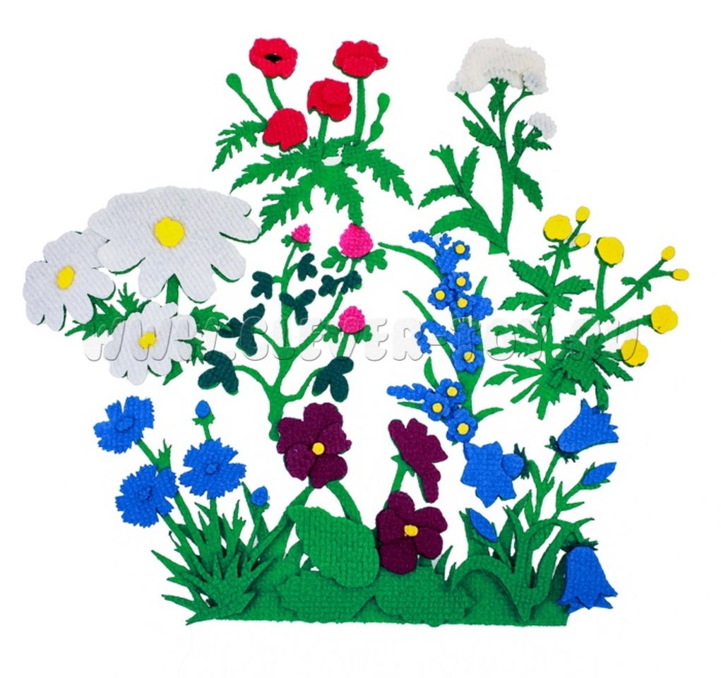 • 8 разнообразных видов луговых цветов, в том числе: мак, колокольчик, ромашка, василёк, лютики, фиалки вместе со стеблями, листьями и травой;