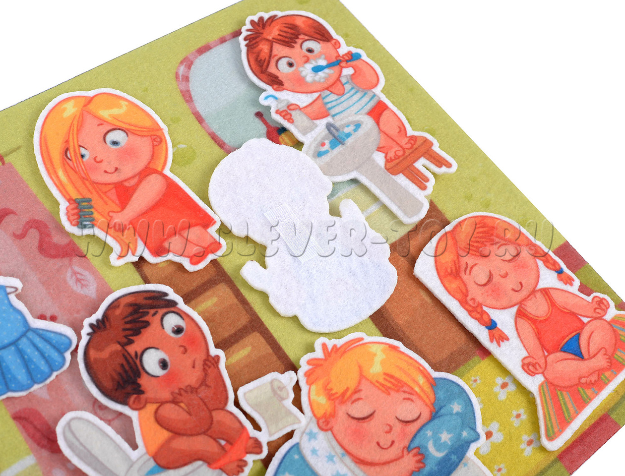 - 9 фигурок: ребёнок, сидящий на горшке, ребёнок, который чистит зубы, кушает, занимается йогой, расчёсывается, спит, одевается, ребёнка, принимающего ванную, ребёнка, закутанного в полотенце после купания;
