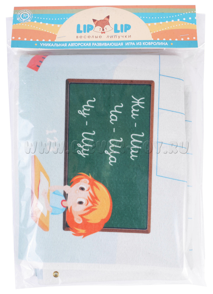 В упаковке находится большое игровое панно с нанесёнными на него клетками под нужным наклоном, что поможет детям в игровой форме познакомиться с понятиями «Печатные» и «Прописные» буквы. В дальнейшем – в начальной школе – ребёнок будет готов к прописям. Вокруг клеток также есть изображения различных школьных атрибутов, маленькая школьная доска с первыми и важными правилами русского языка: «Жи-ши, Ча-ща, Чу-щу».