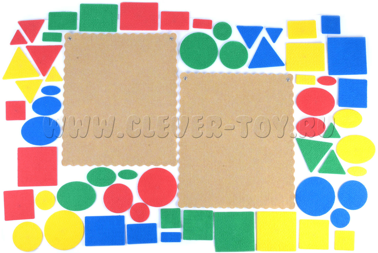 Разноцветные геометрические фигуры выполнены из безопасного современного материала – ковролина, аккуратно вырезаны на специальном станке, легко крепятся на ковролиную игровую основу с помощью многоразовых липучек.