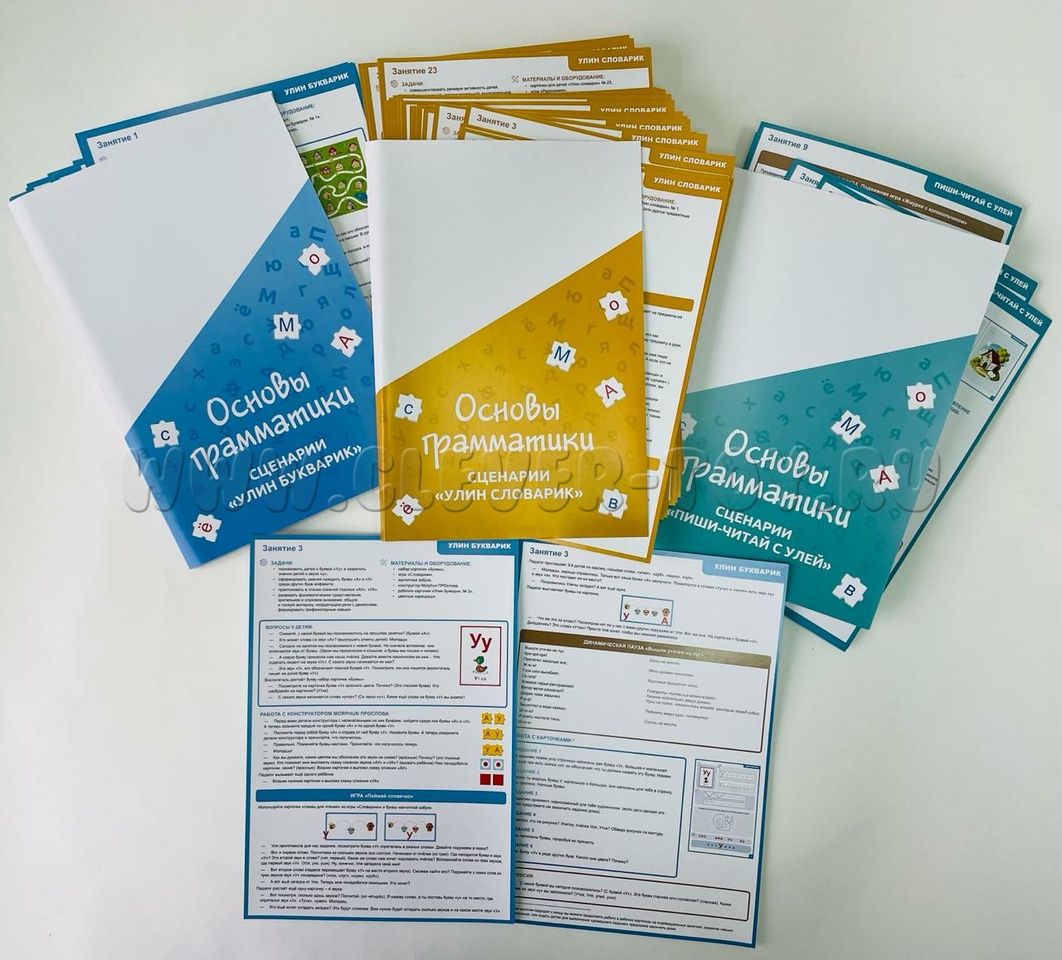 • сценарии занятий «Улин букварик», направленные на развитие речи и навыков звуко-буквенного анализа и формирование представлений о «звуке», «букве», «слоге», «слове». Содержат 35 двухсторонних карточек формата А4.