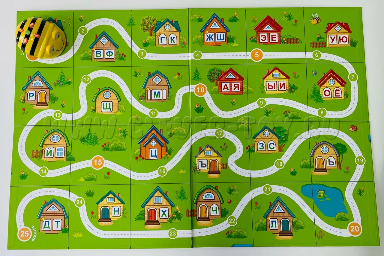 - Игровые двусторонние тематические поля «Городок букв»/«Сказка» и «Слоги»/«Путешествие» для занятий с мини-роботами Bee-Bot и игр в «ходилки»