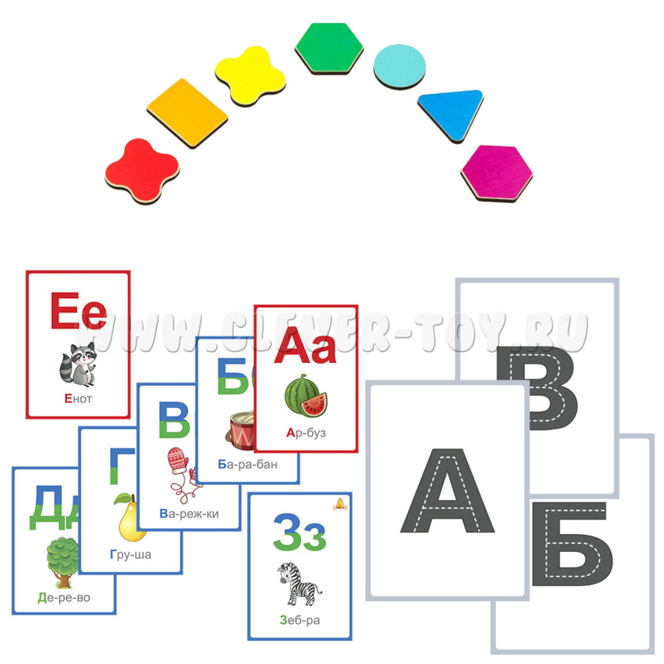 Рабочие карточки для детей предлагаются в трех частях, общее количество карточек – 70 карточек формата А4. Карточки содержат буквы русского алфавита, слова, прописи, раскраски (поставляются в формате PDF на компактном носителе).