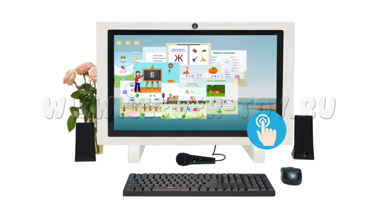Коррекционный комплекс поставляется с игровыми заданиями (более 450) различного уровня сложности, программой речевой диагностики, «говорящим зеркалом», с возможностью загрузки любых других программ, видео- и аудио- материалов, установки любых приложений, совместимых с Windows.