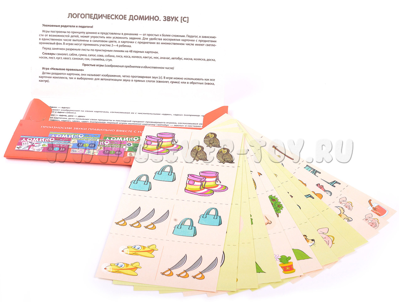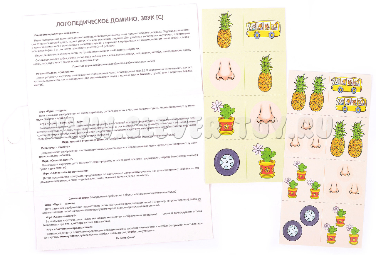 Играя с этим комплектом, ребёнок в игровой форме будет учиться правильно произносить звук [с], а также образовывать форму множественного числа существительных и правильно согласовывать их с числительными и прилагательными. Каждая игра из набора направлена на формирование конкретных умений, необходимых для развития правильного звукопроизношения.