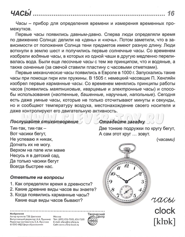 На лицевой стороне каждой карточки дается цветное изображение какого-либо изобретения, на обратной - подробное описание, из которого дети узнают много интересного и поучительного. Для лучшего закрепления материала представлены оригинальные стихотворения и рифмованные загадки по теме, а также вопросы, на которые ребенок ответит после изучения материала или беседы со взрослым. Название каждой статьи имеет перевод на английский язык и транскрипцию.