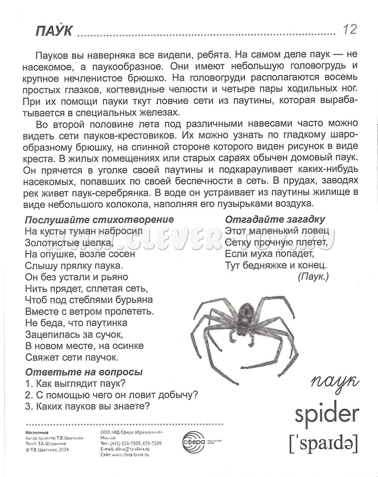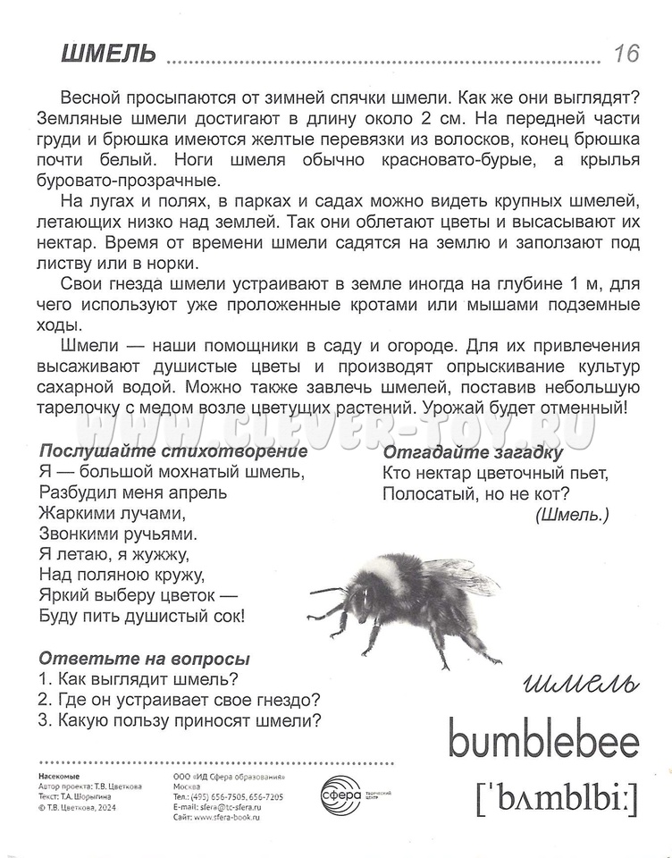 На лицевой стороне каждой картинки дается цветное изображение насекомого - краткое описание, стихотворение, загадка и вопросы по теме. Название каждого насекомого имеет перевод на английский язык и соответствующую транскрипцию. Материал излагается доступным для ребенка языком и целиком раскрывает тему.