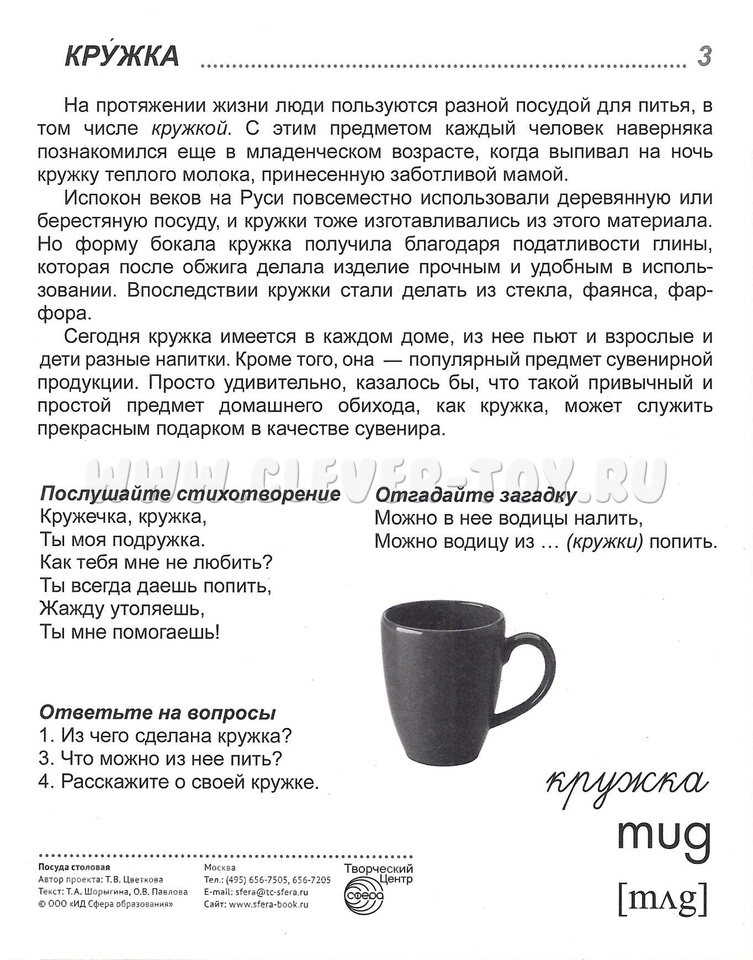На обороте каждой предметной картинки - описание, вопросы для ребёнка, название на русском и английском языках.