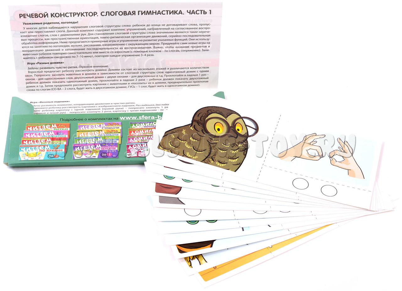"Речевой конструктор. Слоговая гимнастика. Часть 1" - это комплект из 12 листов, включающих 34 карточки и 5 игр.