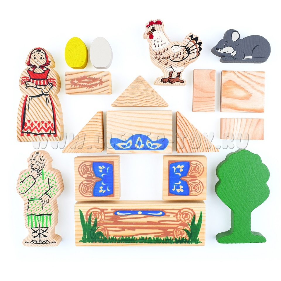 В набор входят деревянные модели персонажей и декорации сказки "Курочка Ряба" (всего 17 деталей).