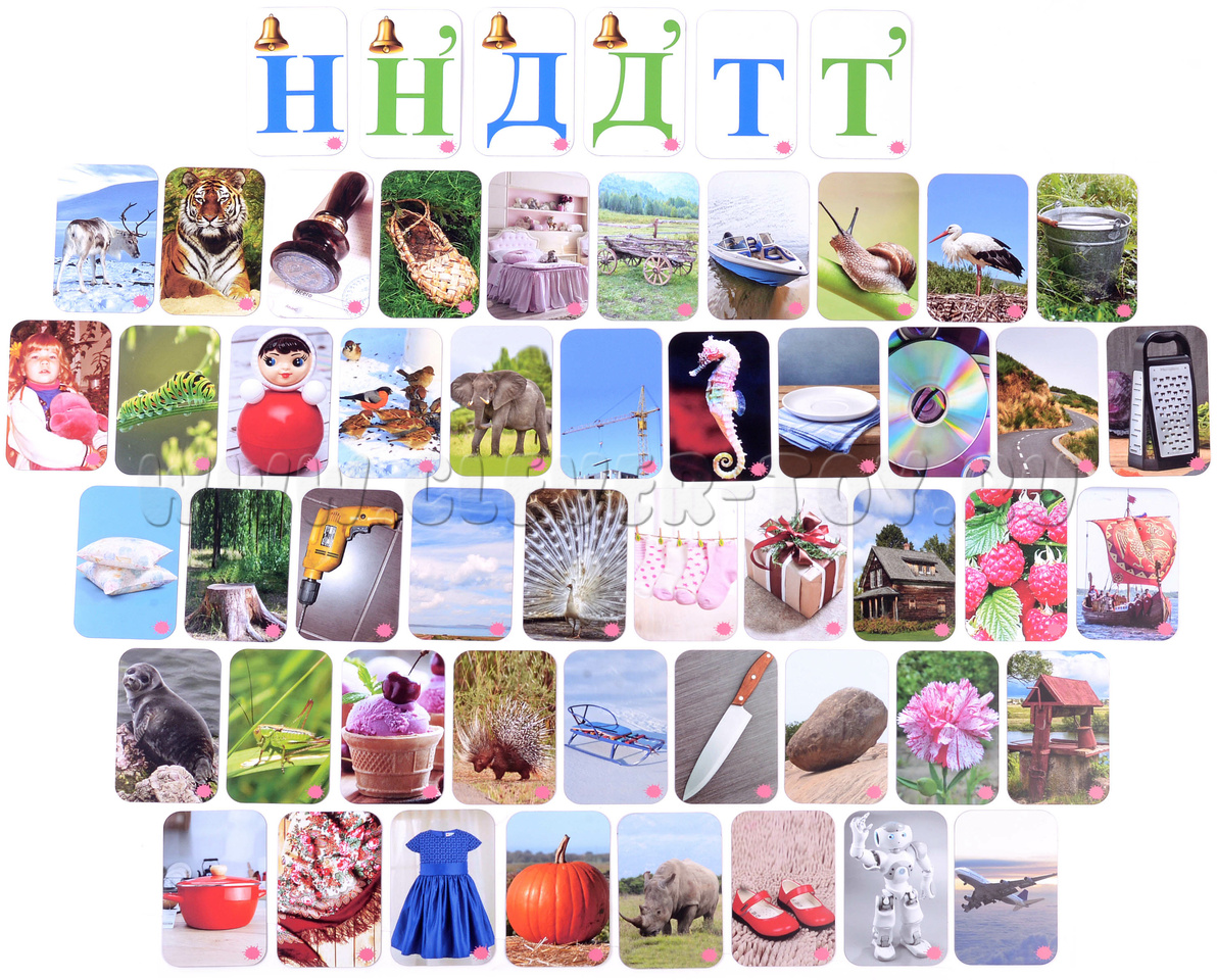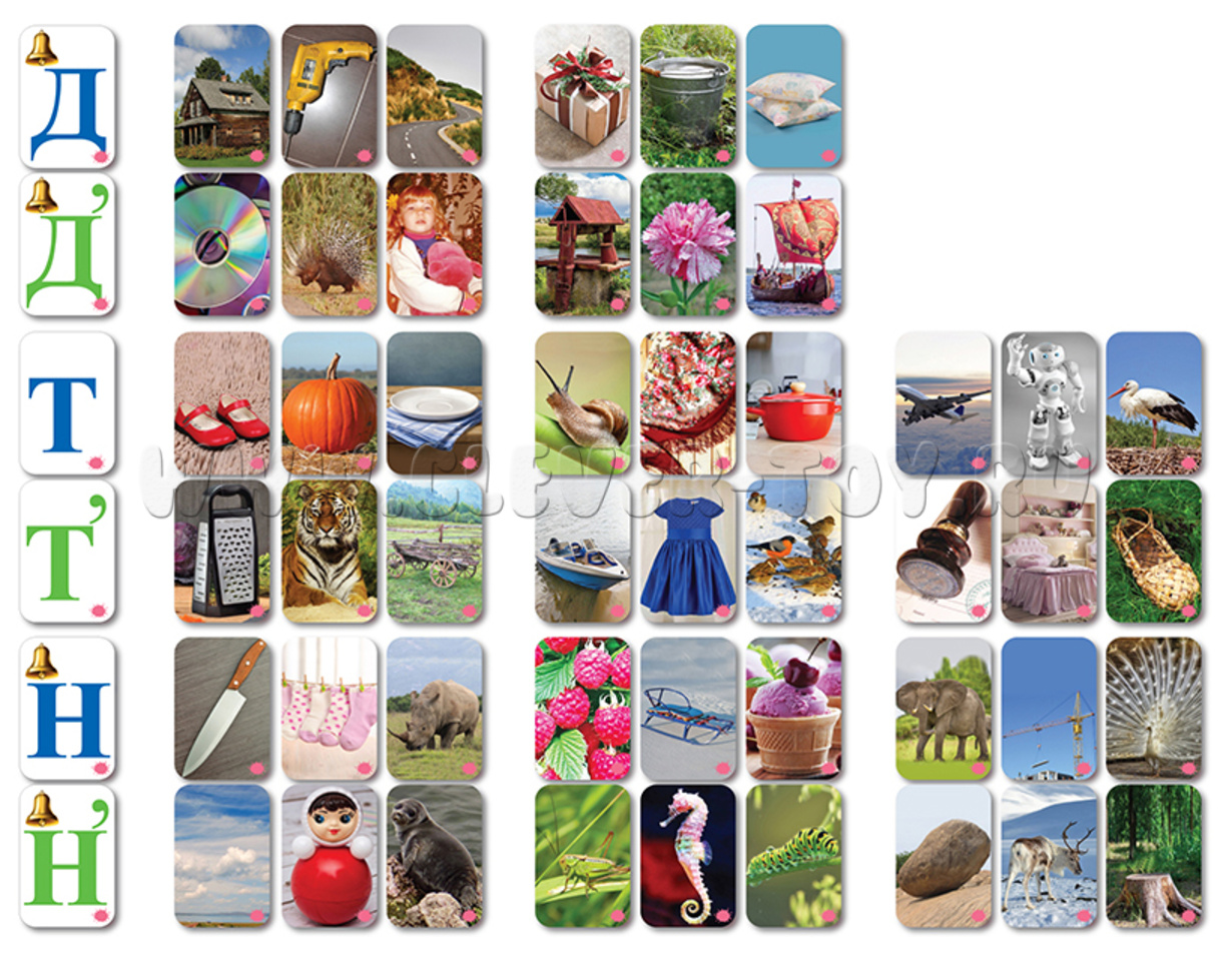 Т, Д, Н, Туфли, Тарелка, Тыква, касТрюля, плаТок, улиТка, аисТ, самолёТ, робоТ; Дом, Дрель, Дорога, поДушки, поДарок, веДро; Нож, Носорог, Носки, малиНа, саНки, морожеНое, краН, слоН, павлиН; Тигр, Тёрка Телега, каТер, плаТье, пТицы, кроваТь, лапоТь, печаТь; Дикобраз, Диск, Девочка, колоДец, гвозДика, лаДья; Нерпа, Небо, Неваляшка, гусеНица, кузНечик, коНёк, камеНь, олеНь, пеНь.