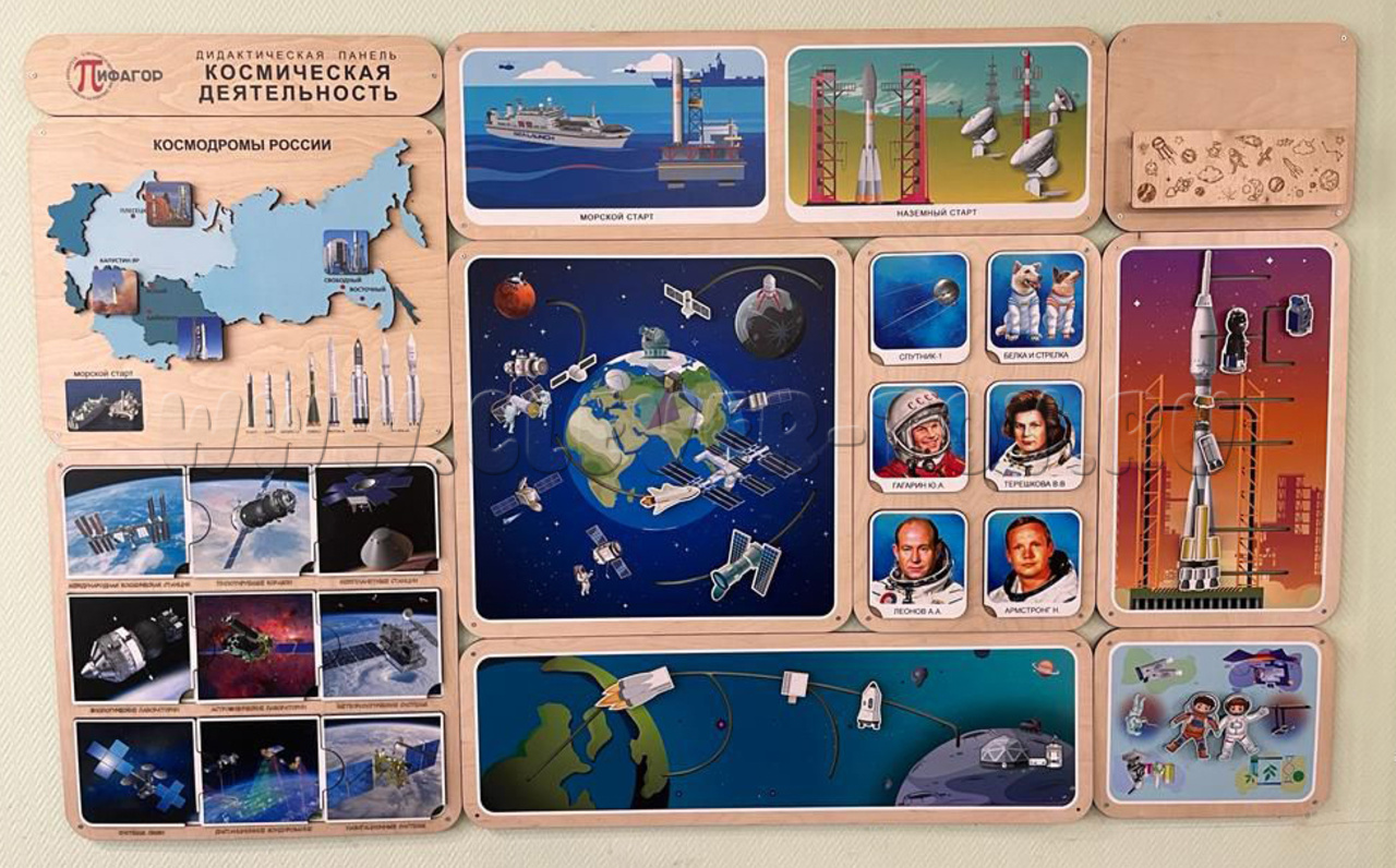 Дидактическая панель "Космическая деятельность" знакомит детей не просто с космосом как красивой темой, а с космической деятельностью человечества как важной областью науки, техники и современной жизни.