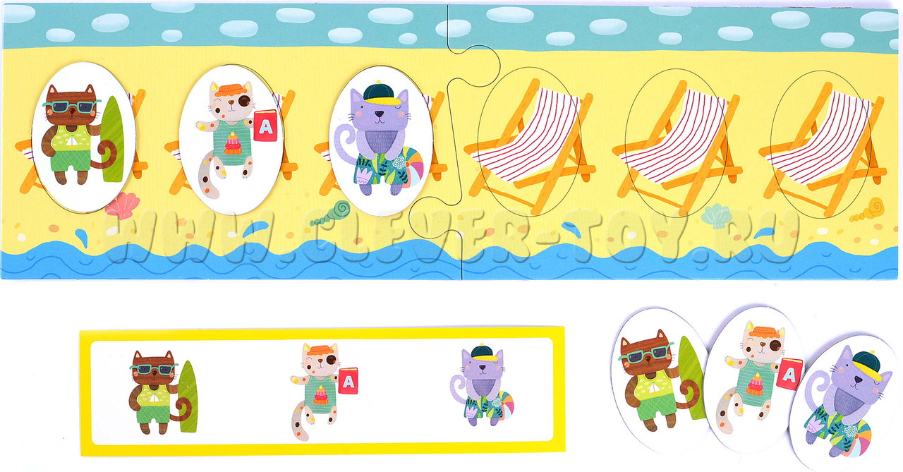 - Игра для поля с шезлонгами (обратная сторона игрового поля). Начинайте с заданий в зеленой рамке: воспроизводите заданную карточкой последовательность котят. Более сложные задания предлагают не только продолжить ряд, но и установить взаимосвязь и закончить последовательность самостоятельно. К этим заданиям стоит переходить, когда малыш уверенно справляется с зелеными карточками.