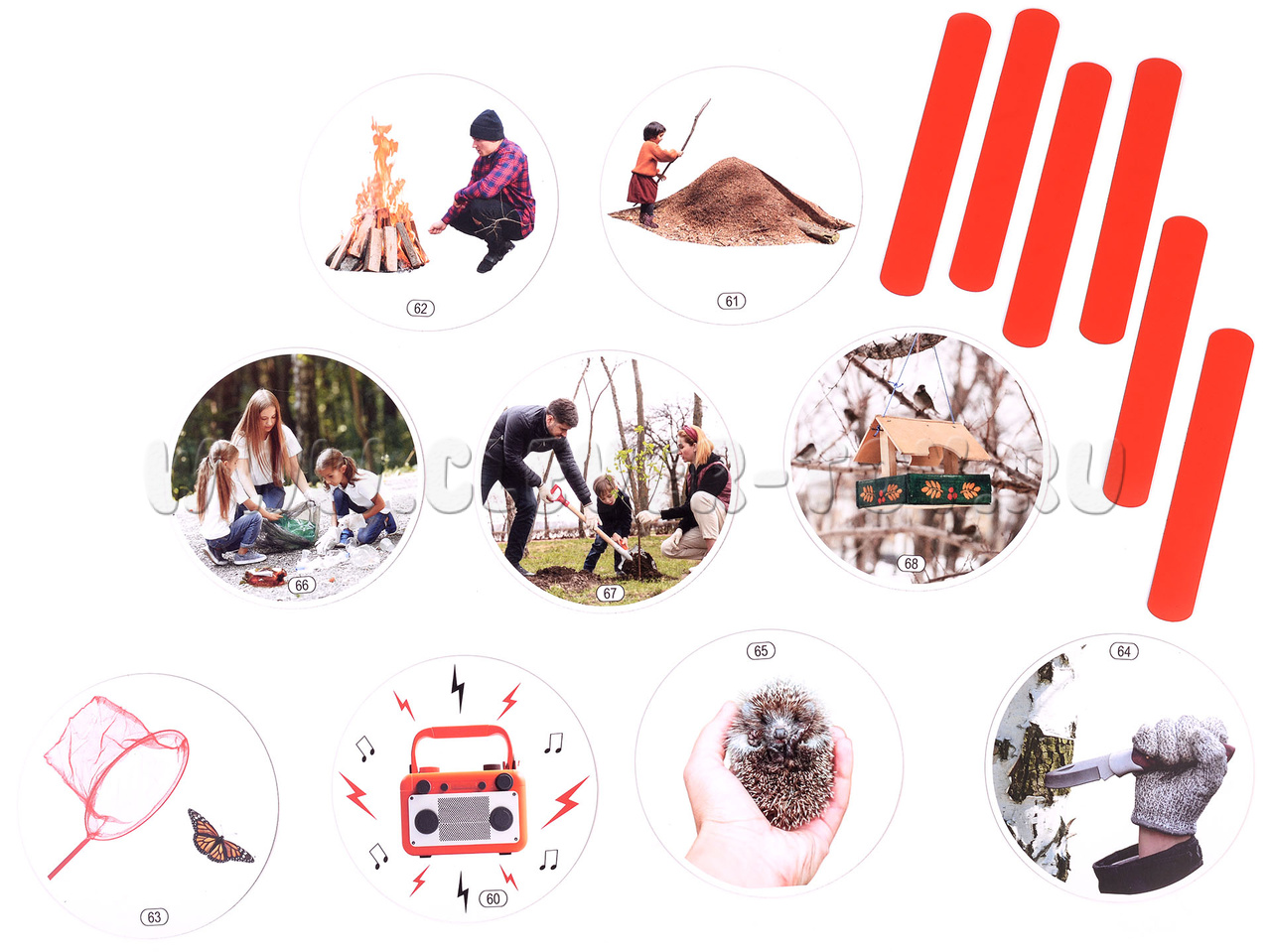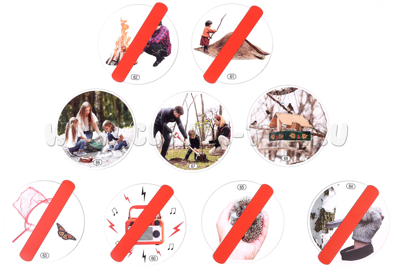 В наборе 15 карточек. Они входят в комплект магнитного плаката "Лес" и имеют сквозную нумерацию, поэтому номера начинаются не с единицы. Однако каждый набор можно использовать как самостоятельное пособие. 6 красных магнитных полосок длиной 13 см. Дети могут "зачеркнуть" ими действия и ситуации, которые недопустимы в лесу. Карточки с изображениями (11,5 см): 60: Соблюдай тишину; 61: Не разрушай муравейник; 62: Костёр; 63: Не лови бабочек; 64: Не режь деревья; 65: Не уноси животных из леса; 66: Уноси мусор; 67: Сажай деревья; 68: Устанавливай кормушки для птиц.