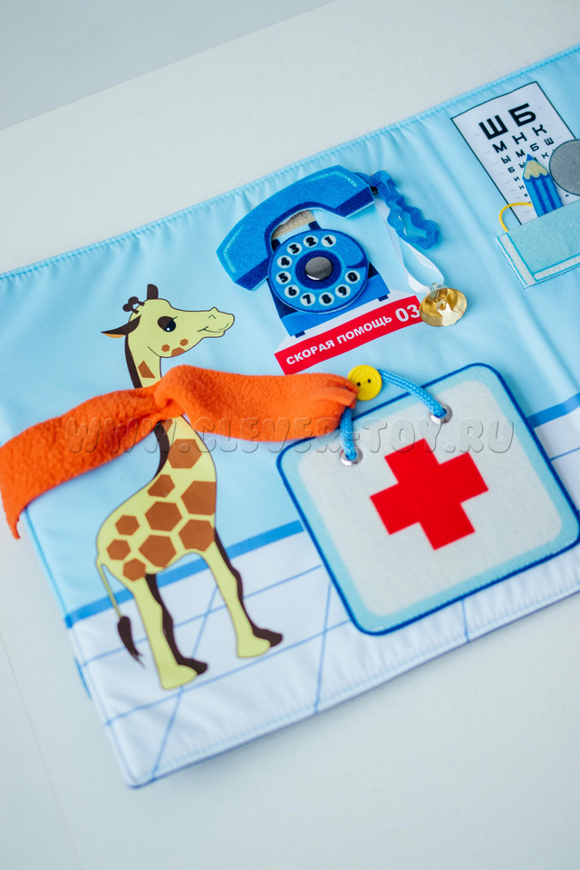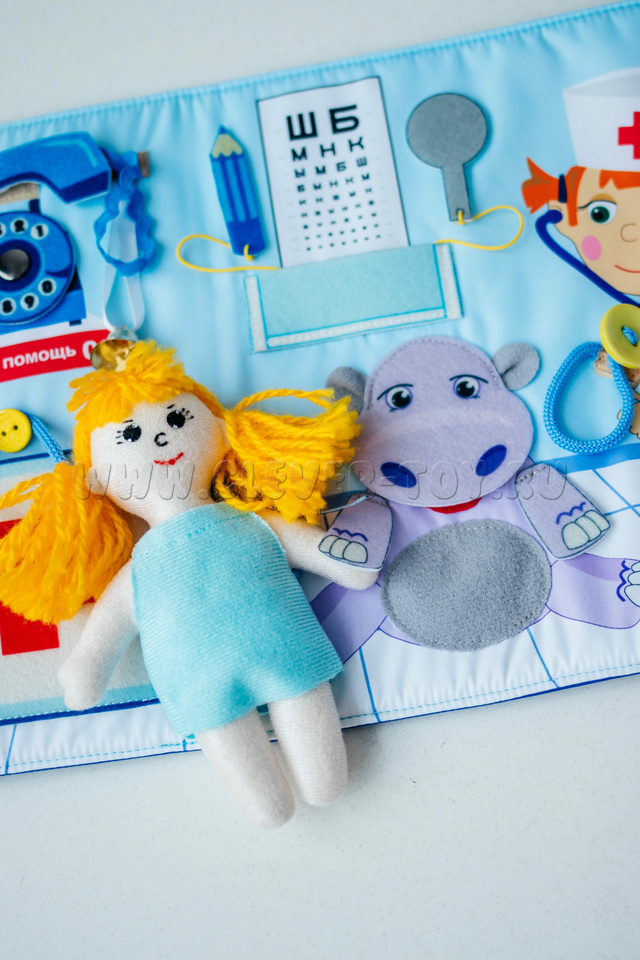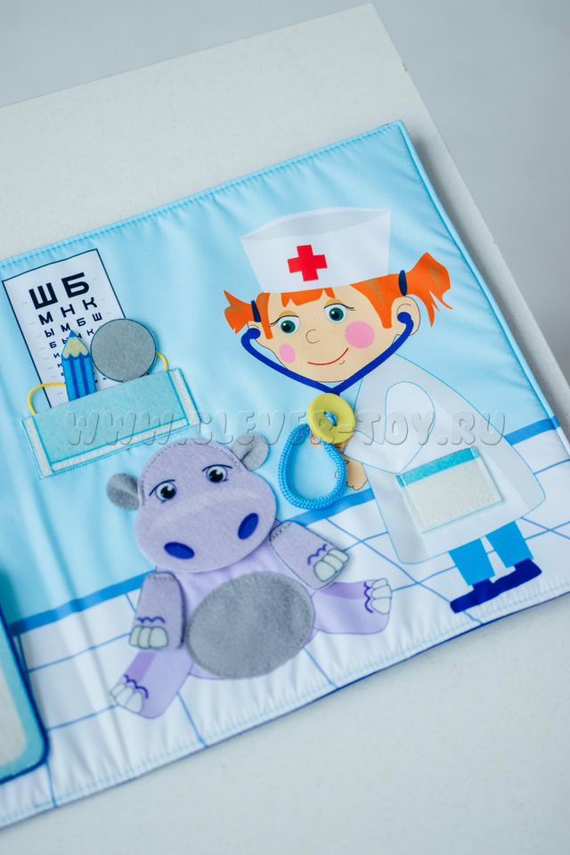 Вместе с куклой ребёнок будет лечить своих игрушечных друзей, прослушивать их, проверять зрение и слух, записывать результаты. В папке есть все необходимые медицинские инструменты и препараты.