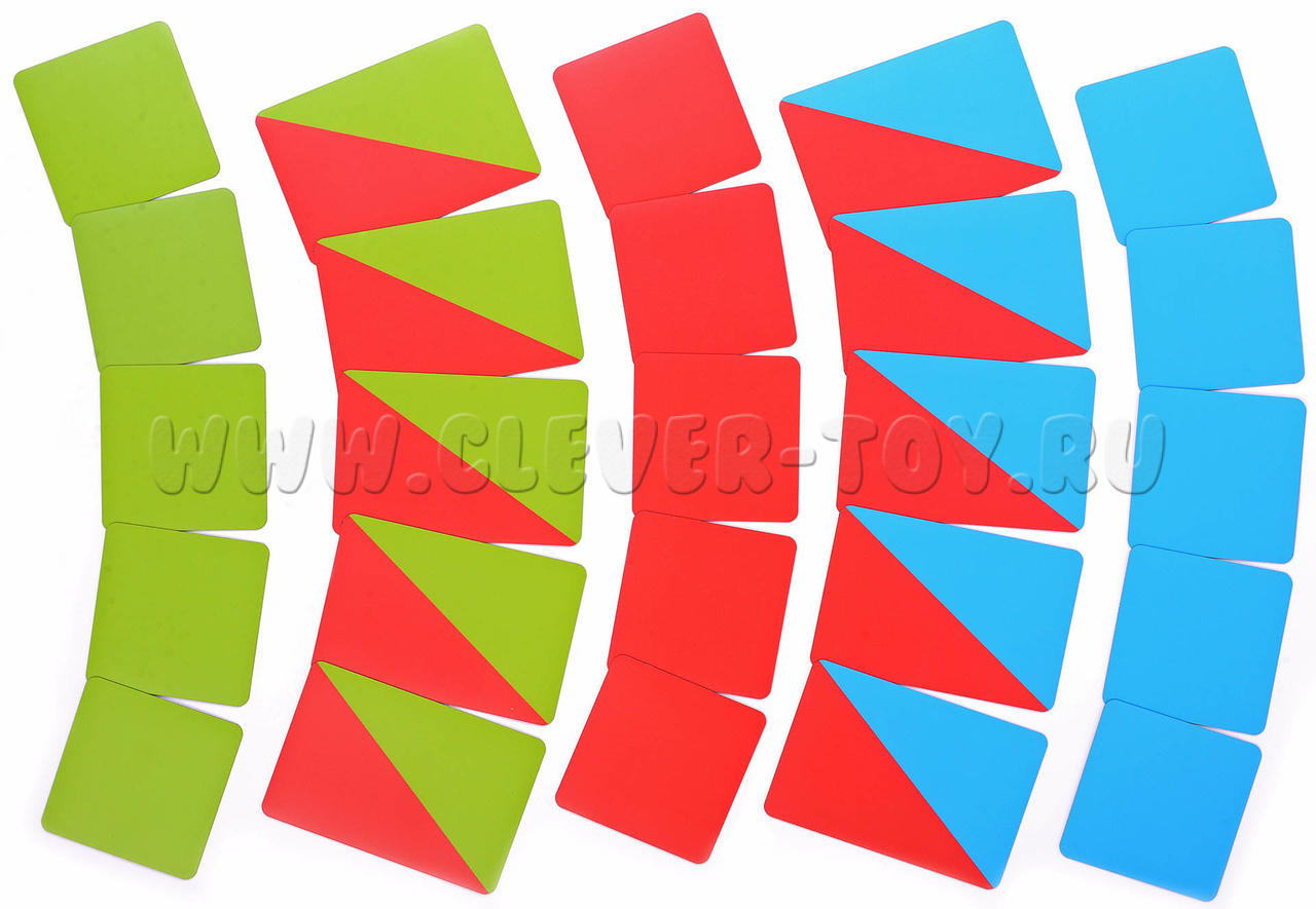 По пять карточек 7cм * 7 см красного, синего и зелёного цвета для фонетического обозначения отдельных букв или слогов с одной гласной.