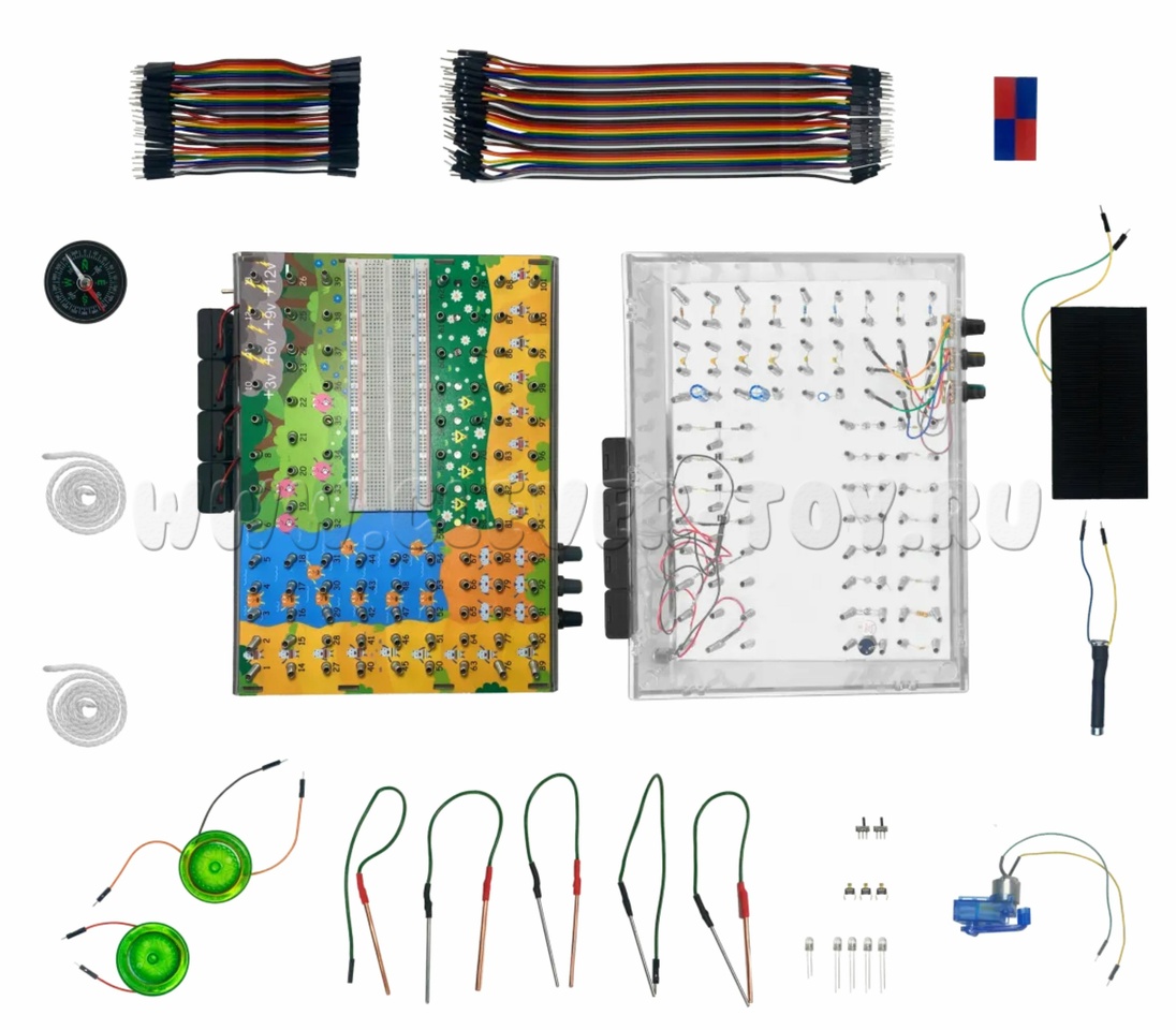 Комплекс «ЭЛЕКТРОНИКА ДЛЯ ЮНЫХ ГЕНИЕВ» предназначен для обучения основам электричества, электротехники и электроники для детей от пяти лет.