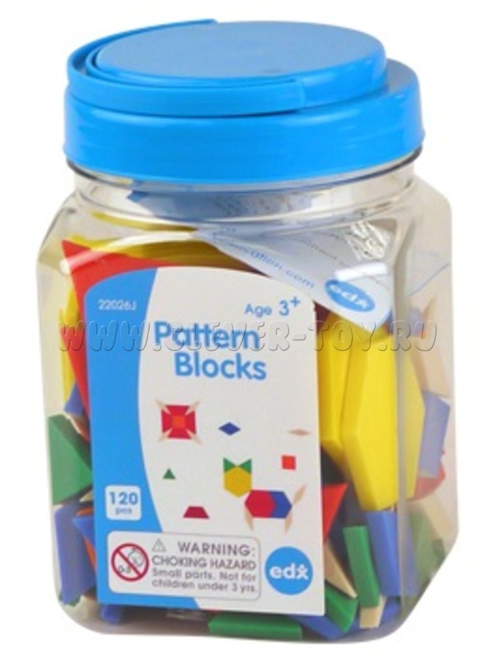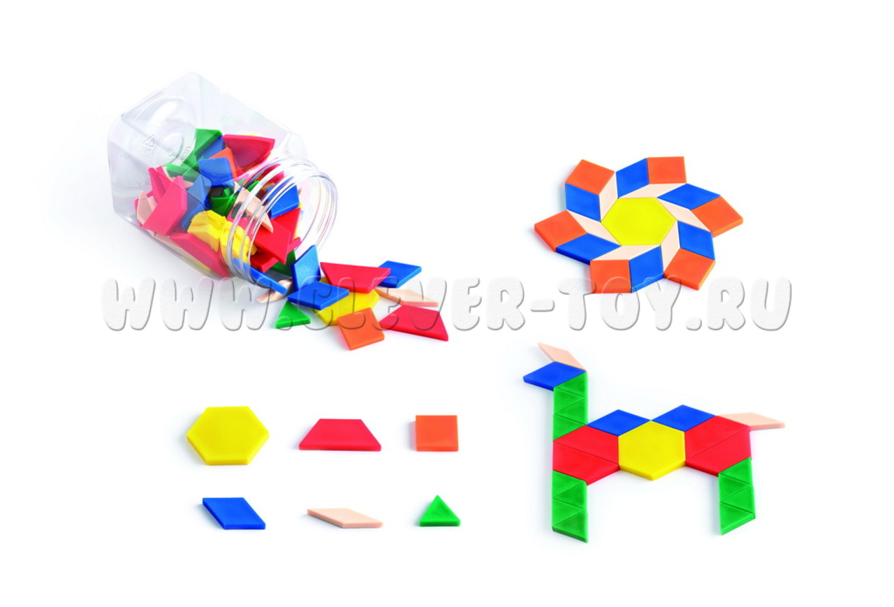 Игровой набор "Геометрические фигуры" состоит из 120 элементов 6 форм (шестигранник, трапеция, ромбы 2 видов, треугольник, квадрат) в 6 ярких цветах.